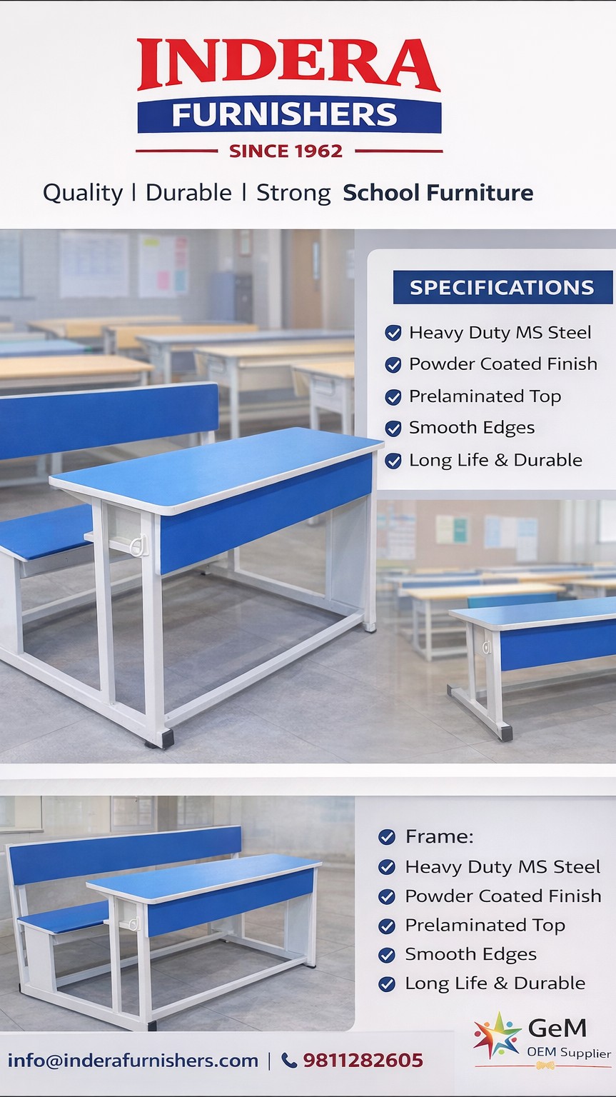 Indera Furnishers has been a trusted manufacturer of school furniture since 1962, delivering durable, high-quality products designed for long-lasting performance. With decades of experience, we specialize in manufacturing strong and reliable school desks, benches, and classroom furniture that meet the needs of modern educational institutions. Our commitment to quality craftsmanship, timely delivery, and customer satisfaction has earned us the trust of schools and institutions across the region. At Indera Furnishers, we take pride in creating furniture that supports better learning environments and keeps our customers happy